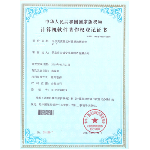 計(jì)算機(jī)軟件注冊權(quán)登記證書——光伏變流器實(shí)時數(shù)據(jù)檢測系統(tǒng)V1.0