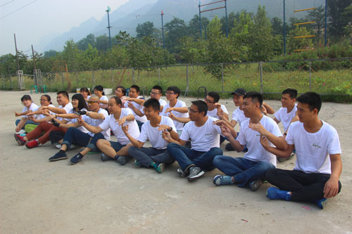 我們先進行了拓展前的熱身活動,兩個簡單的小游戲消除了大家彼此間的陌生感,活躍了氣氛。然后,大家被教練分成兩組,并被要求在半小時內(nèi)選出隊長,取隊名,定口號,繪制隊旗,選定隊歌并擺出團隊造型。大家都集思廣益,分工合作,各顯其能。